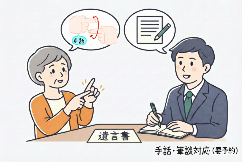 ※手話対応は日常会話程度です。法律上の判断や重要事項の確認は、筆談・書面(文章)で行います。